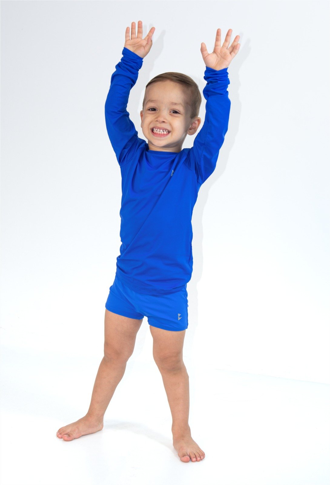 Camisa infantil de manga longa com proteção UV 50+, feita em poliamida com elastano, oferecendo conforto, mobilidade e segurança ao sol.